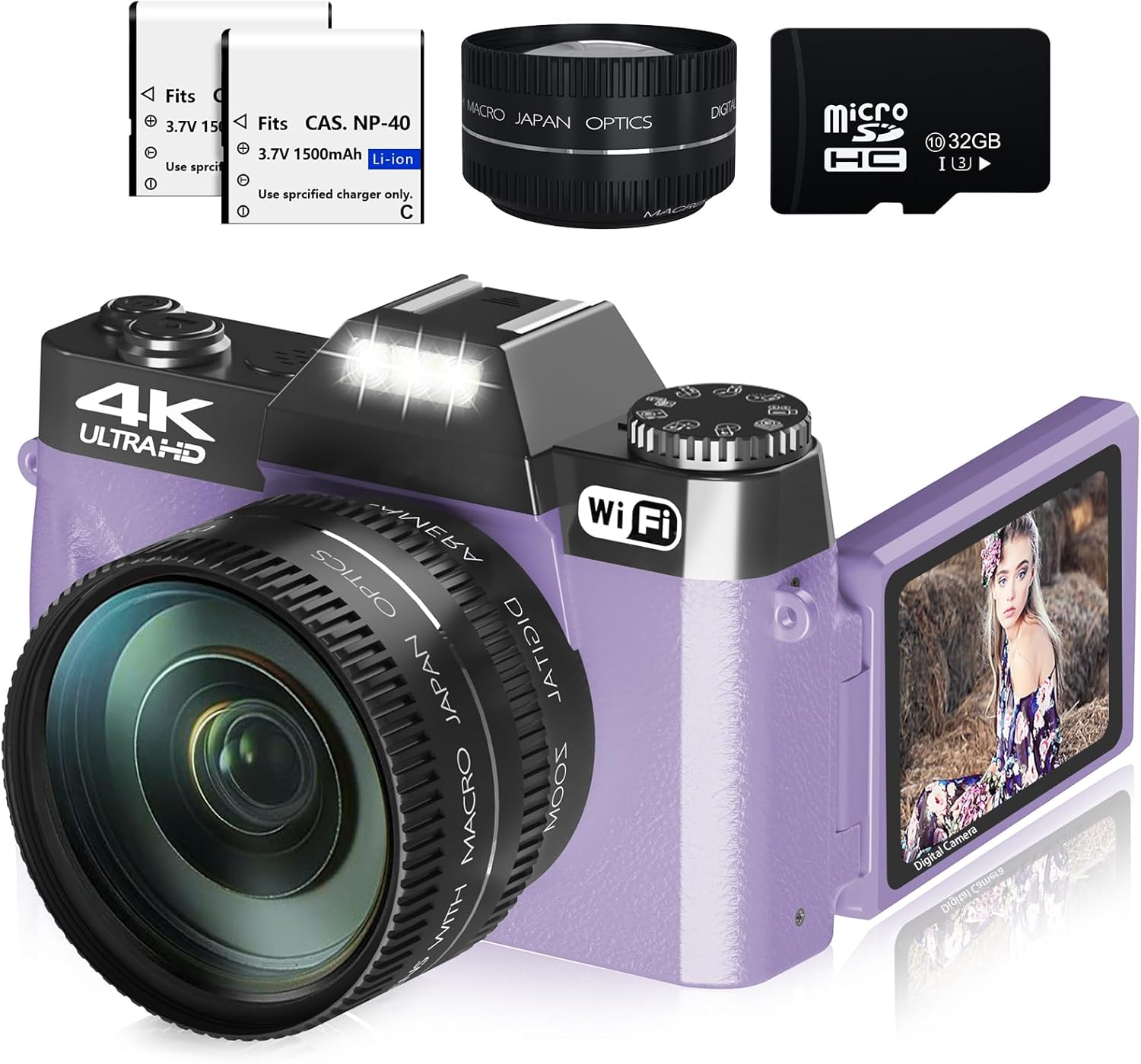 Digitalkameras für Fotografie, 4K 48MP Vlogging-Kamera, 16-facher Digitalzoom, manueller Fokus, wiederaufladbar, Studenten, Kompaktkamera mit 52 mm Weitwinkel- und Makroobjektiv, 32 G TF-Karte und 2