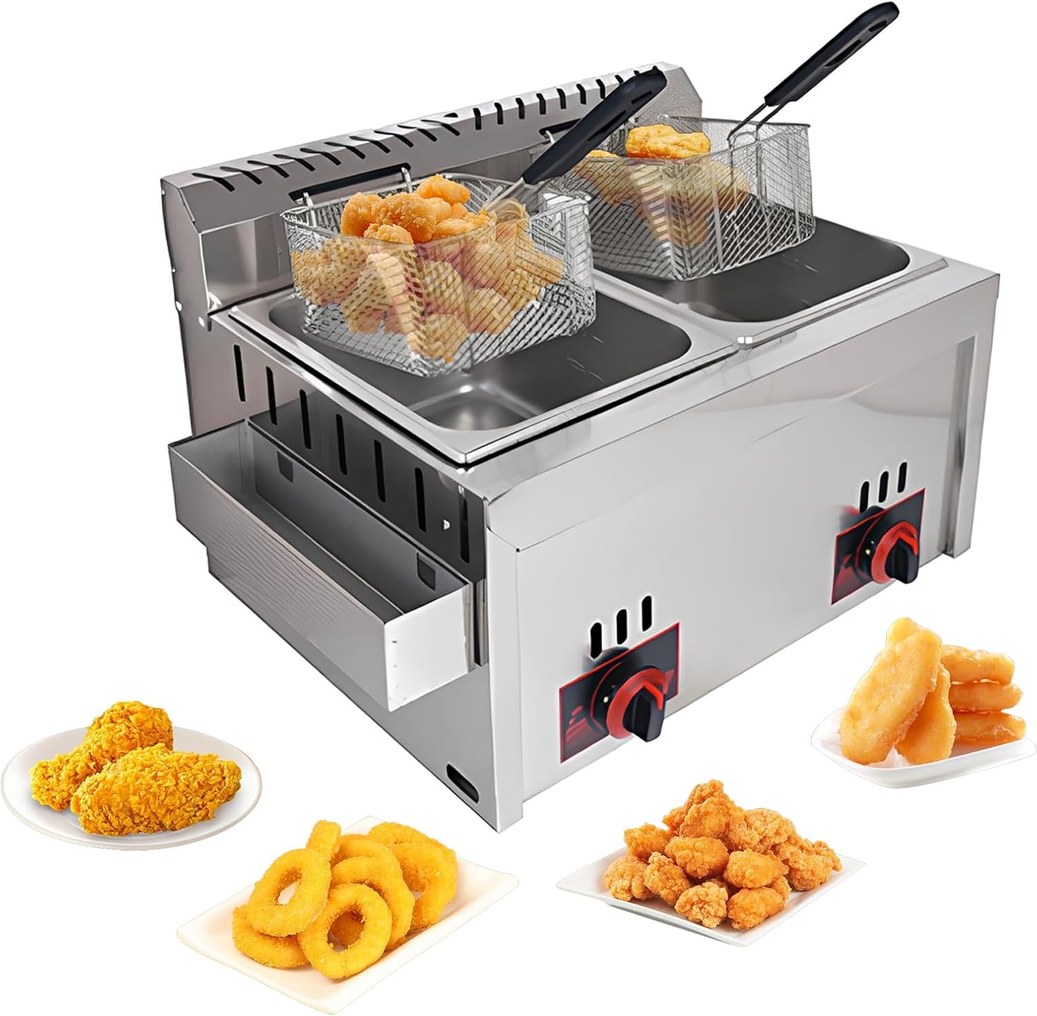 Doppel-Fritteuse, Gas Fritteuse mit 2 Frittierkörbe, Edelstahl, 2x6L Fassungsvermögen, Elektronische Zündung, Maximale 200 °C, Schnelles Aufheizen für Haushalt und Gewerbliche Nutzung