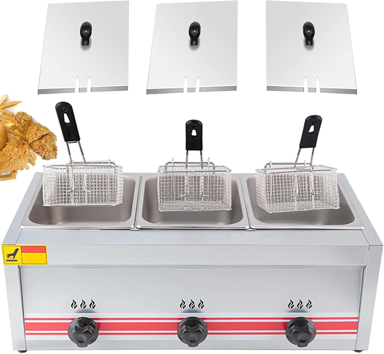 Kommerzielle LPG-Gas-Fritteuse mit 2 Tanks mit 10 L x 2/3 Korb und Deckel, Edelstahl, große Kapazität, Propan, LPG mit Metallrohr, für Pommes Frites, Zuhause, Küche, Restaurant (3 Körbe)