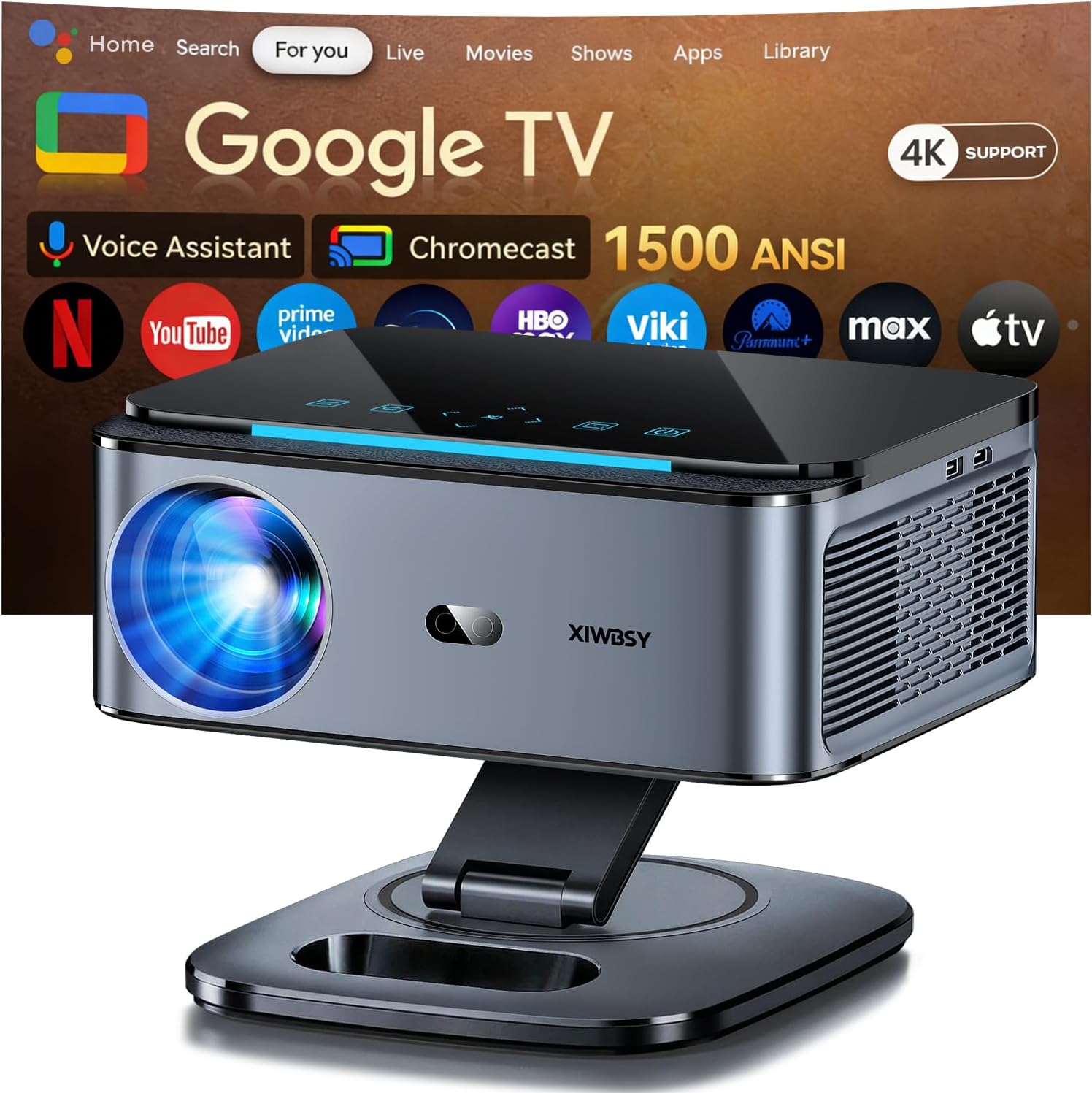 Beamer 1500 ANSI/Autofokus/360°-Drehung XIWBSY Projektor 4k Google TV/Sprachsteuerung, WiFi 6 Bluetooth 5, 38000 Lumen, Heimkino/Outdoor Beamer Netflix