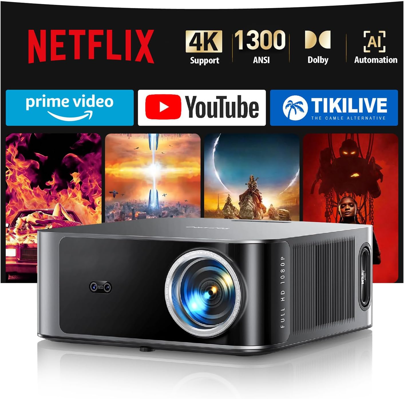 4K Beamer kompatibel mit Netflix und Dolby Audio iSinbox Smart Beamer 1500 ANSI, HDR10+, Autofokus, Staubgeschützt, 6D Keystone, WiFi 6 und Bluetooth Heimkino und Outdoor