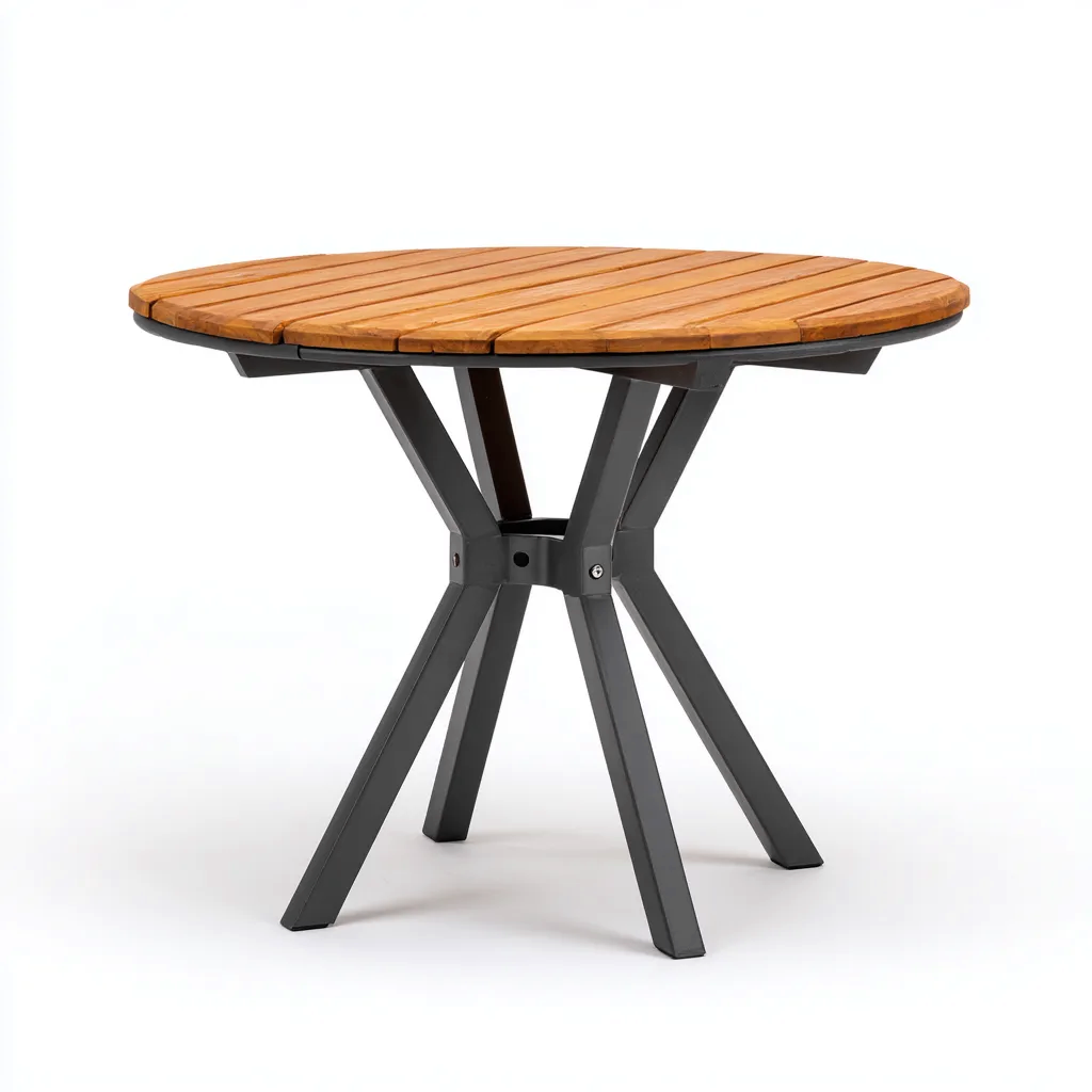 Dieser kompakte runde Gartentisch eignet sich für Balkon, Terrasse oder kleinere Außenbereiche. Die Kombination aus natürlicher Holzoberfläche und klar geformtem Metallgestell verleiht dem Tisch eine moderne und funktionale Ausstrahlung.