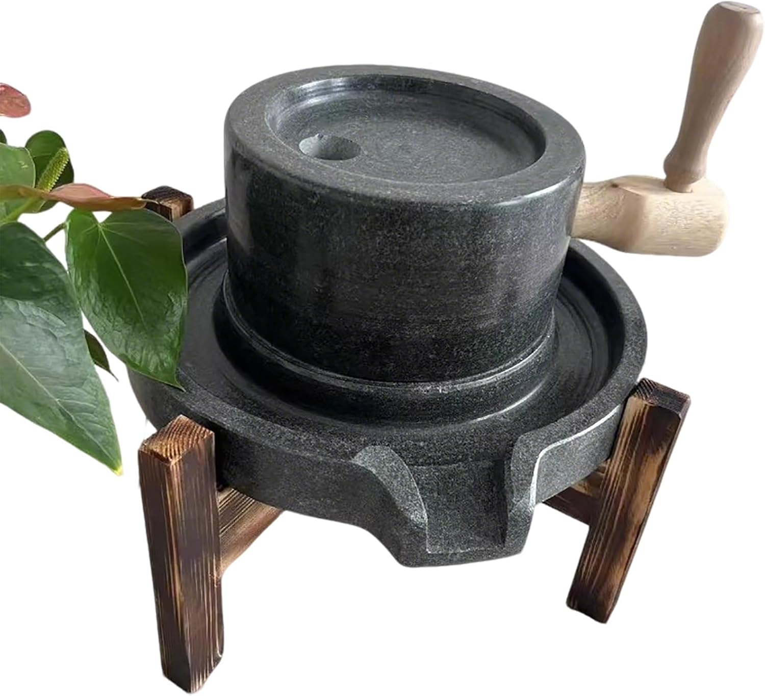 Getreidemühle aus Stein, Manuelle Steinmühle, Haushalts-Handmühle für Getreide mit Holzständer, Kleiner Gewürzzerkleinerer, Glattem Blaustein, Handgekurbelte Nass-/Trockenmühle