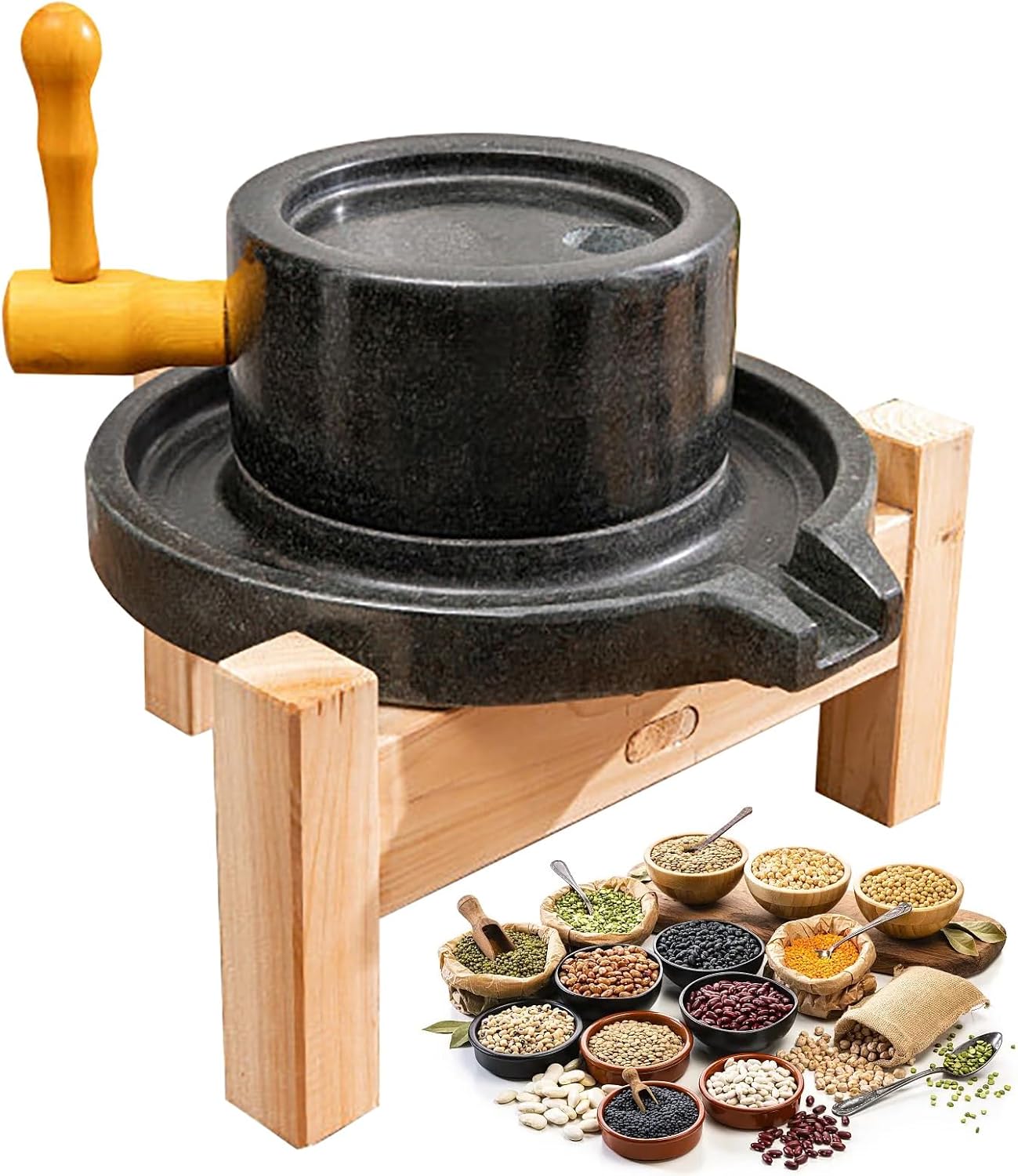 Manuelle Steinmühle Mit Holzständer,Mahlscheibe Aus Naturstein,Haushalts-Handmühle Für Getreide,Handgekurbelte Nass-/Trockenmühle(20cm/7.9in)