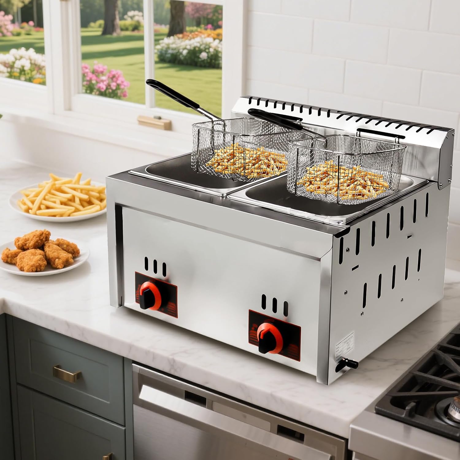 Professionelle Gasfritteuse, 20L Gewerbliche Doppeltank Friteuse Edelstahl Fritteuse mit Hoher Kapazität, Gas Küchenbratmaschine mit Pommeskorb für Restaurant, Heimküche, Snackbar