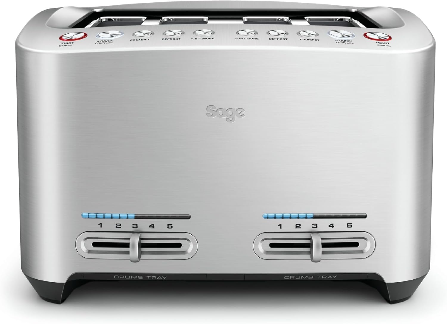 Sage - The Smart Toast - 4-Scheiben - Toaster mit Extra-Breiten Schlitzen - 5 Einstellungen, Schnelle Reinigung, Absenken auf Knopfdruck - Bräunungsgradkontrolle, Liftfunktion - Gebürstetes Aluminium