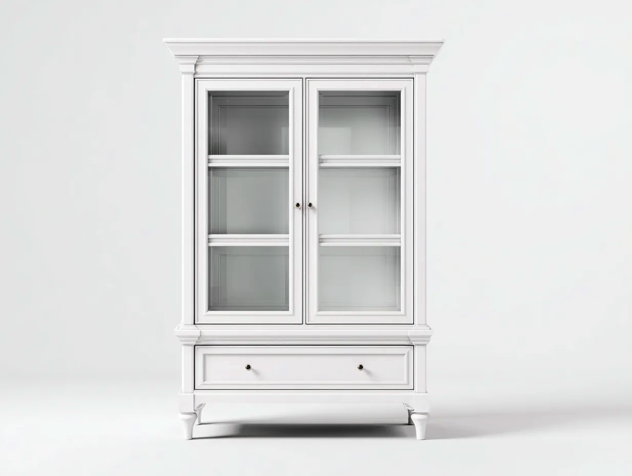 Die Glasfront ermöglicht eine klare Sicht auf den Inhalt und schützt diesen vor Staub. Der untere Stauraumbereich ergänzt die Nutzungsmöglichkeiten und unterstützt eine ordentliche Aufbewahrung im Alltag.
