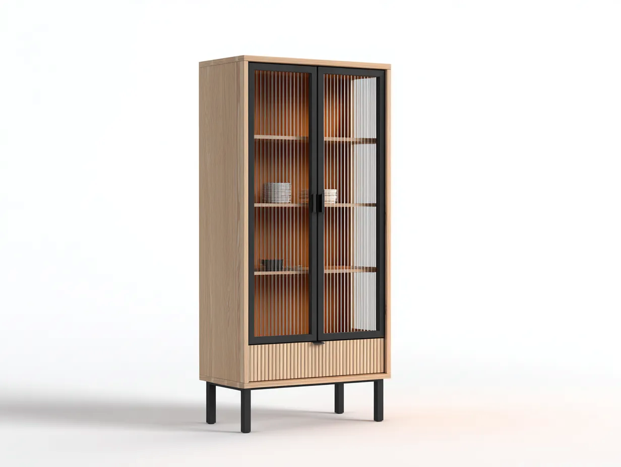Gefertigt aus Holz, Glas und Metall überzeugt die Vitrine durch eine stabile Konstruktion. Die Holzoberfläche zeigt eine natürliche Farbgebung, kombiniert mit schwarzen Metallelementen. Die geriffelten Glastüren sorgen für eine dezente Durchsicht und eine besondere optische Tiefe.
